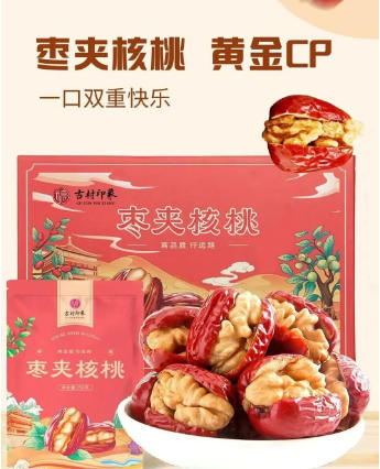 当香甜软糯的红枣邂逅香脆营养的核桃,一场美味的碰撞就此上演。古村印象枣夹核桃,精选优质红枣与饱满核桃,匠心搭配,让你一口咬下,同时感受红枣的甜润与核桃的醇香,双重美味在舌尖绽放,是日常解馋、补充能量的绝佳选择。