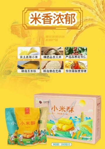 古村印象小米酥,选用黄土高原小米、精选大米等优质原料,传统工艺制作,米香浓郁,口感酥脆香甜,一口咬下,仿佛回到了无忧无虑的小时候,是承载着回忆的美味零食,也是馈赠亲友的特色佳品。