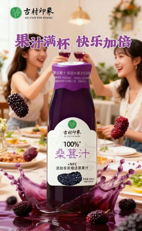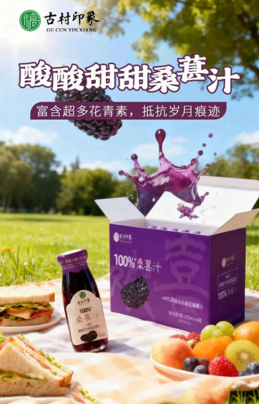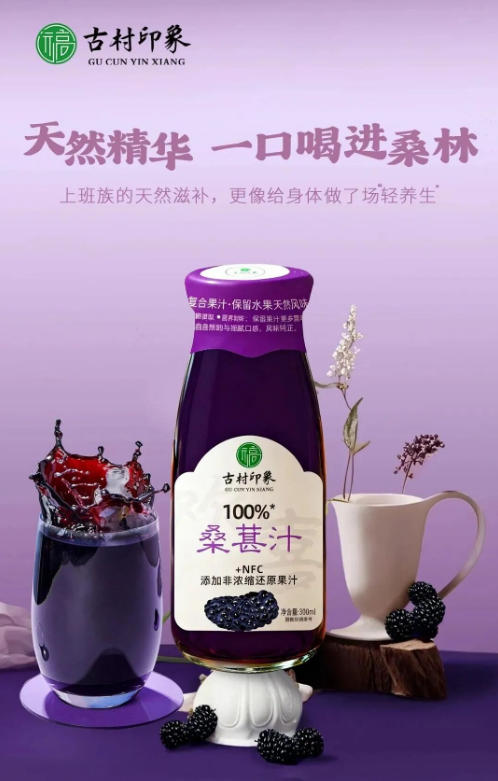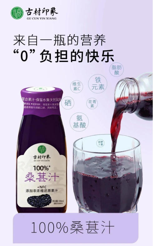 谁懂啊!喝果汁也能喝出“轻养生”的快乐打工人的日常:咖啡续命、熬夜赶工,想补点营养又怕麻烦?古村印象这瓶100%桑葚汁,直接把“桑林的自然精华”装进瓶里——NFC非浓缩还原工艺,鲜榨锁鲜,一口下去全是桑葚的酸甜本味,连防腐剂、粘稠剂都没加,喝着完全没负担!